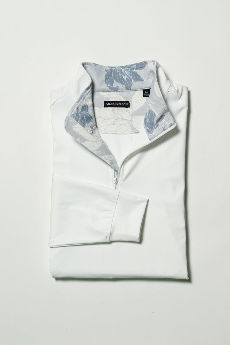 Stay cool and stylish in the Floral Contrast Performance Quarter Zip. This lightweight white pullover wicks away moisture to keep you dry while teeing off or during casual wear. A playful floral collar adds a fresh twist, while a hidden zippered chest pocket secures essentials. Cuffed sleeves deliver a snug fit, blending comfort and flair on and off the green.