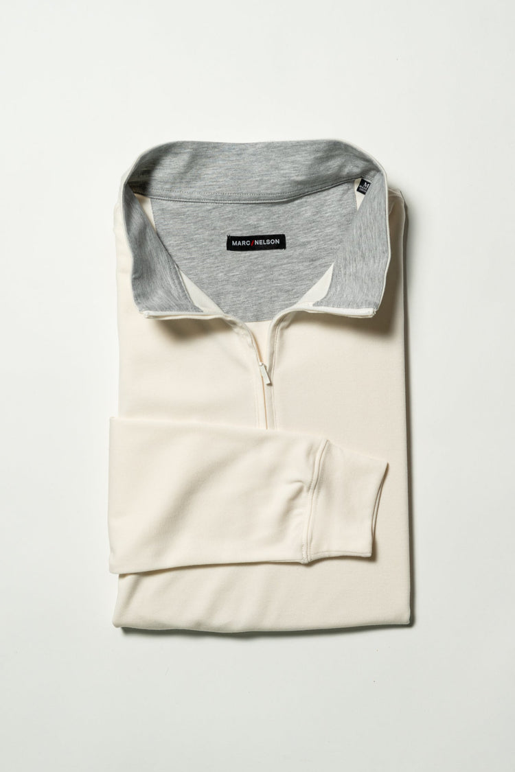 The Ivory Pique Classic Quarter Zip combines lightweight comfort with clean style. It features a breathable pique knit composed of 55% poly and 45% cotton at 140gsm to wick moisture and maintain structure. A grey contrast collar adds visual interest. The quarter-length zipper adjusts airflow and refines the silhouette. This slim-fit pullover layers under jackets or stands alone. Each piece ships with detailed care instructions and a size chart link.
