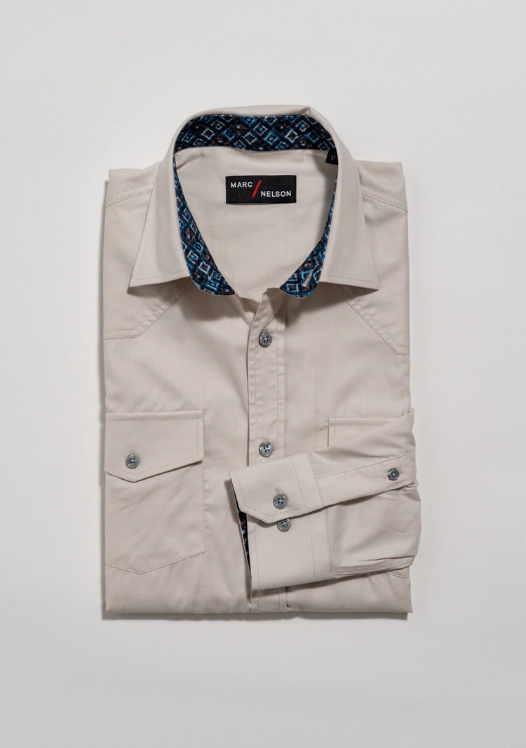This western shirt blends classic styling with modern comfort. Crafted from gentle, breathable Tencel fabric, it delivers a light, elegant touch and regulates temperature throughout wear. Shell buttons highlight the placket and cuffs with subtle sheen. Expert tailoring creates a balanced silhouette that moves freely, enhancing relaxed settings and supporting polished layering. The fabric resists wrinkles, retains shape, and wicks moisture to maintain a fresh feel across daily use and care routines.