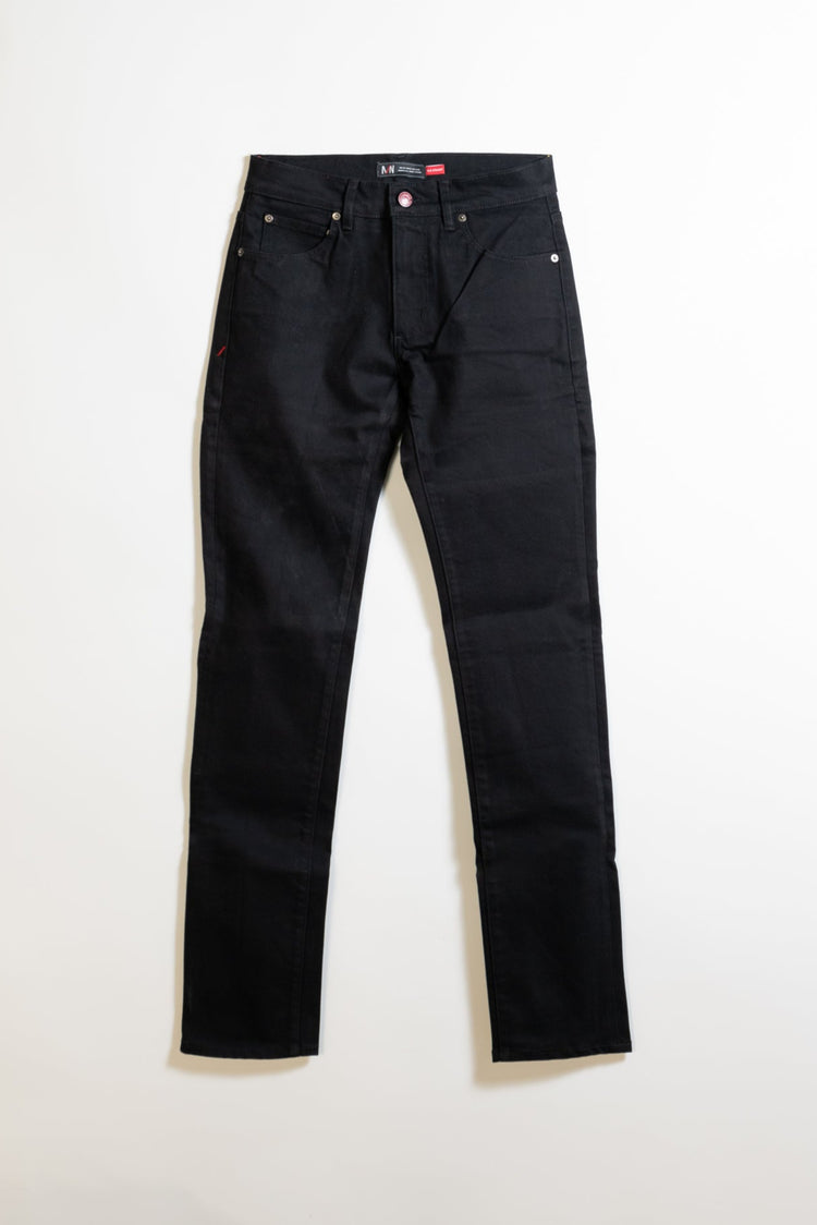 The Nelson Black Denim blends comfortable stretch denim into a straight slim cut. It shapes the leg with a narrow thigh and calf while retaining shape after repeated wear. A zip front adds clean closure. Each pant features a 34" inseam. Enter measurements in the additional info section at checkout to request an alternative inseam length. Once hemmed, garments may not be returned or exchanged. Machine washing cold and air drying preserve the fabric’s elasticity and color. Made in the USA using premium denim, this pair offers lasting structure and subtle stretch that adapts to movement without losing its slim profile. It moves seamlessly between casual and smart casual ensembles.