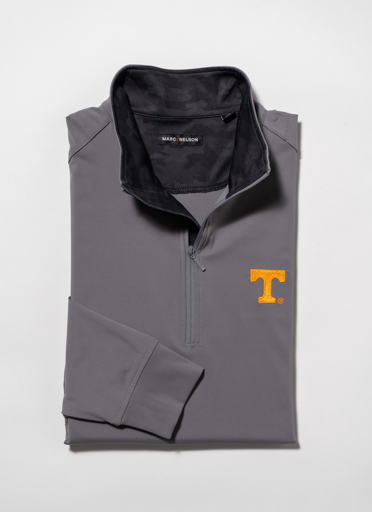 This quarter-zip pullover in smoke gray blends lightweight, moisture-wicking fabric to keep you dry and comfortable whether you’re on the golf course or off. Its four-way stretch adapts to every swing while engineered seams move with your motion. The slim-fit silhouette elevates the modern look while maintaining full mobility. A sleek black camo contrast collar and bold Power T on the chest display Vols pride. A hidden zippered chest pocket secures essentials as you move with ease and style on the green.